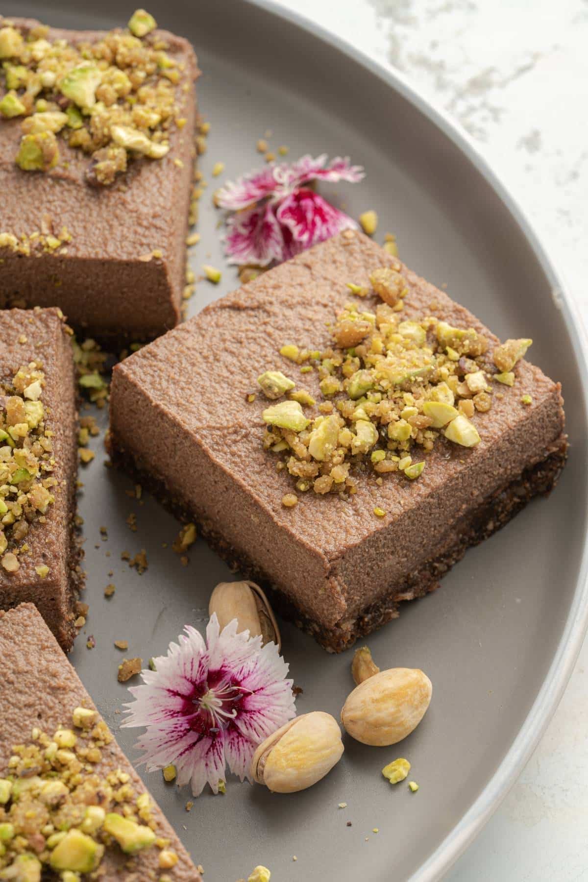 - Cut the chocolate pistachio bars in to squares and sprinkle the pistachio pieces on them before serving
